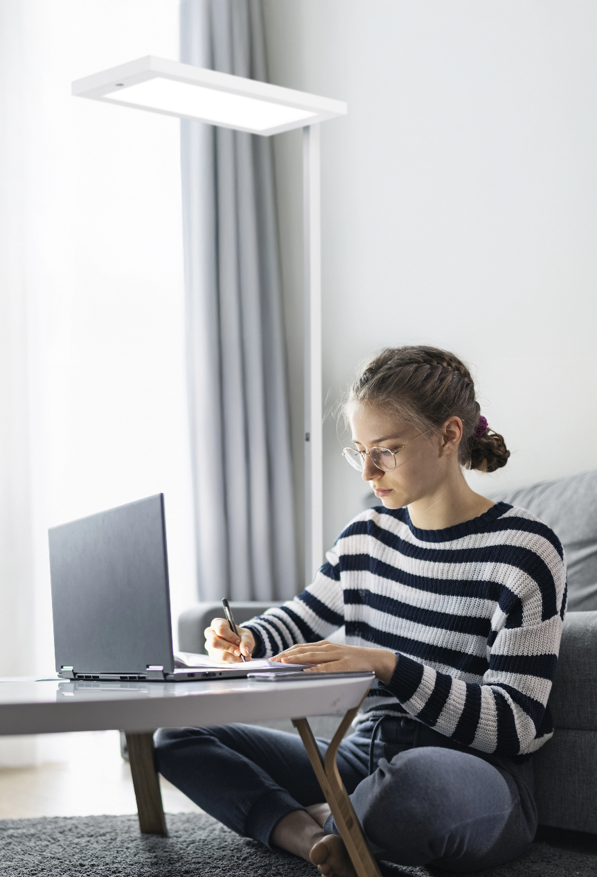 Reduce eye fatigue with LAVIGO.core Home’s UGR ≤16 rating, the same glare control standard used in professional offices. LAVIGO’s floor lamp design delivers 89% indirect ambient light and 11% direct task lighting, eliminating the glare and harsh spots that cause eye strain. The result is comfortable focus during extended homework sessions.